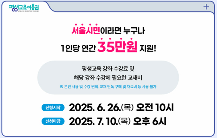 이젠 소득 관계없이, 서울시민이면 누구나 연간 35만 원 지원! 놓치면 후회하는 꿀 혜택, 바로 **‘2025년 평생교육이용권 2차 지원’**입니다 🎓📚